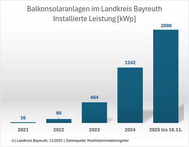 Die Energiewende kommt auf den Balkon: Im Landkreis Bayreuth sind bis Mitte November 2025 bereits 2.100 steckerfertige Solaranlagen installiert – mit einer beeindruckenden Gesamtleistung von über zwei Megawatt. Damit hat sich die installierte Leistung im Vergleich zu 2023 fast verfünffacht. Damals lag die Gesamtleistung noch bei 464 kWp – ein klares Zeichen für den anhaltenden Boom.